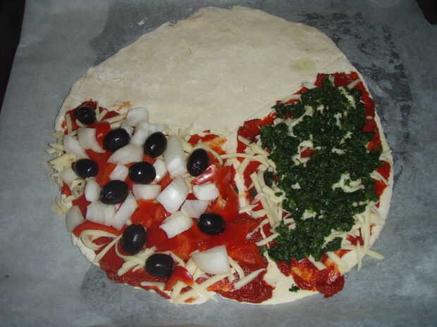 Añadir las espinacas a una de las secciones para completar la sección de arranque y luego en la otra sección agregar la pimienta, cebolla y aceitunas para completar la sección del curso principal.