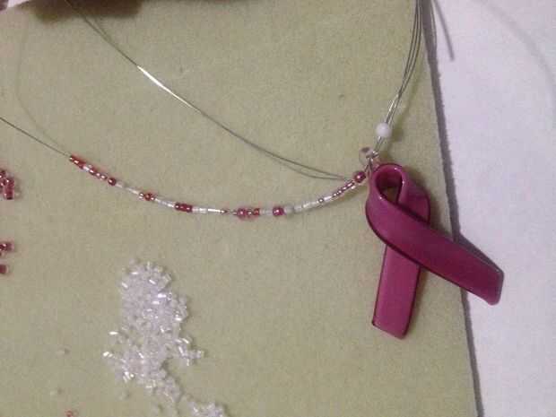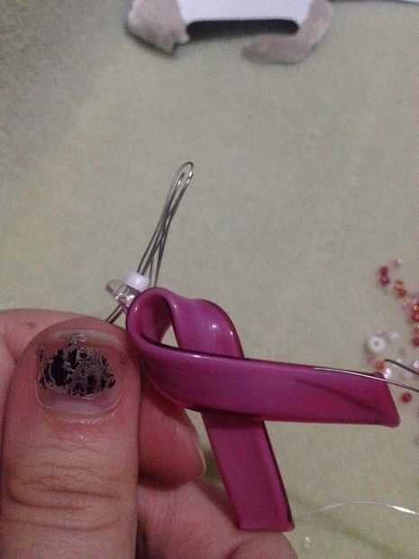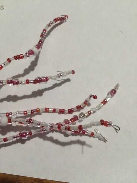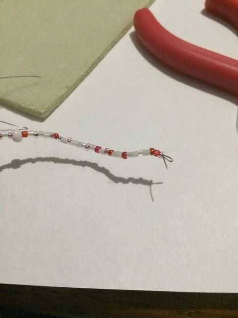 Consejos! Hacer uno de sus seis filamentos de alambre (tres a cada lado de la pendiente) a la vez. Una vez que termine ese filamento, donde queda la pulgada del alambre, agache la porción del cable para que sus granos no caiga el hilo. No esta misma técnica de plegado en uno de los lados de la pendiente mientras haces tu primera parte de tres hilos de perlas para que la pendiente se mantiene en el mismo lugar en el cable.