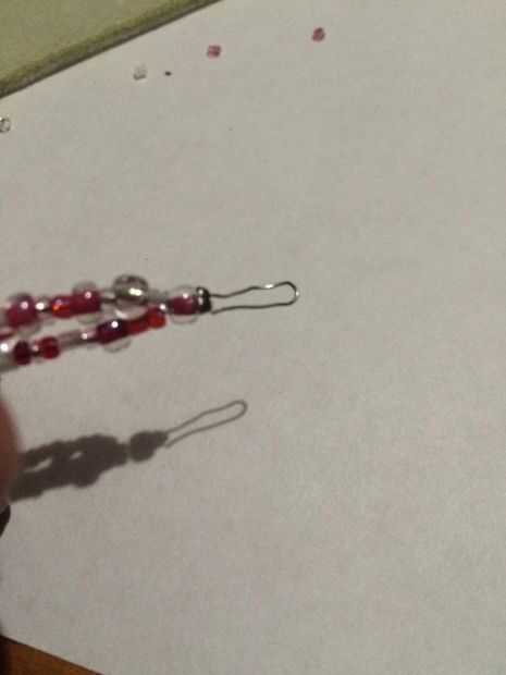 Corte dos de los cables cerca del anillo del gancho. Con el cable restante uno, vuelta a hacer una forma bucle. Poner un anillo del clip sobre esta forma de bucle y deslice hacia abajo lo más cerca del primer anillo del clip. Para fijar la forma en su lugar con el anillo del gancho, aplastar contra el alambre. El lazo de su collar se hace en este lado! Asegúrese que el colgante de su collar aún en medio de su trabajo del grano antes de ir al siguiente paso.