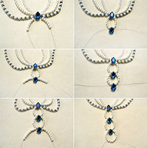 4, seguir cadena de perlas blancas. Luego, hacer un lazo y cruzar el hilo de tigre.