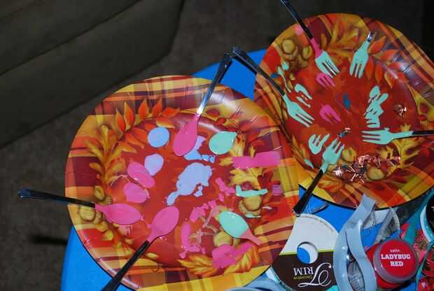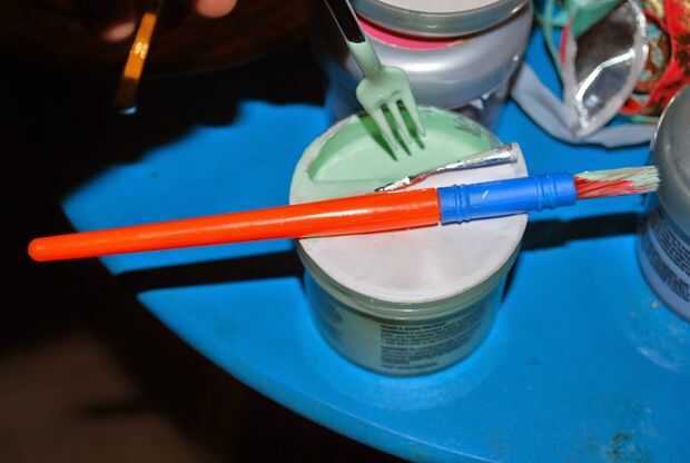 Las piezas del juego son tenedores y cucharas. Para agregar interés visual a los tenedores y cucharas me sumergió los tenedores y cucharas en pintura complementaria y coloca ondisposable la placa se seque.