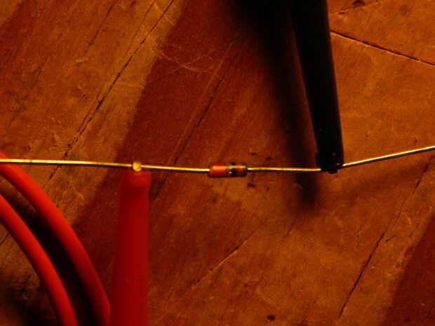 Un diodo prueba con este medidor encenderá sólo uno de los LEDs si es bueno (se puede saber la orientación del diodo por el cual uno se enciende). Si el diodo es un LED sí mismo el probador debe tener suficiente corriente para luces de 1/2 de la salida de onda cuadrada. Esta prueba de diodo no verifica especificaciones completas del diodo y exponer el diodo a mucho voltaje reverso. También puede utilizar para probar el LED son diodos y se enciende sin importar de qué manera están conectados.