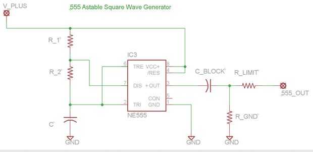La salida del 555 tiempo se pasa a los amplificadores op mediante un condensador (C_BLOCK) para que la onda sea AC con respecto a la tierra de la fuente dual, esto hace que la salida del amp op bipolares (oscilaciones por encima y por debajo del suelo). También añadimos la resistencia (R_LIMIT) para proteger contra cortocircuitos en la salida y R_GND para asegurarse de que el valor de salida Centro permanece centrado en la tierra.