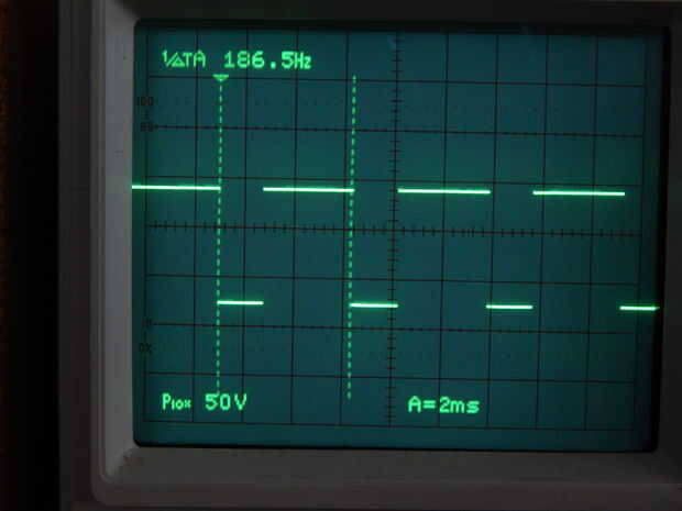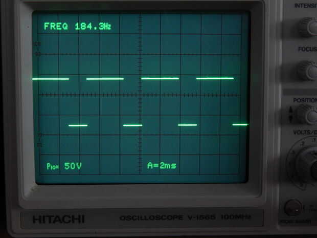 Para probar un 555 temporizador insertar y buscar a la salida (justo después del condensador C_BLOCK). Puede utilizar el detector o un osciloscopio para mirar la salida. Tenga en cuenta que la señal directa de la clavija de salida oscila desde suelo a la alimentación positiva de casi, pero nunca es negativa.