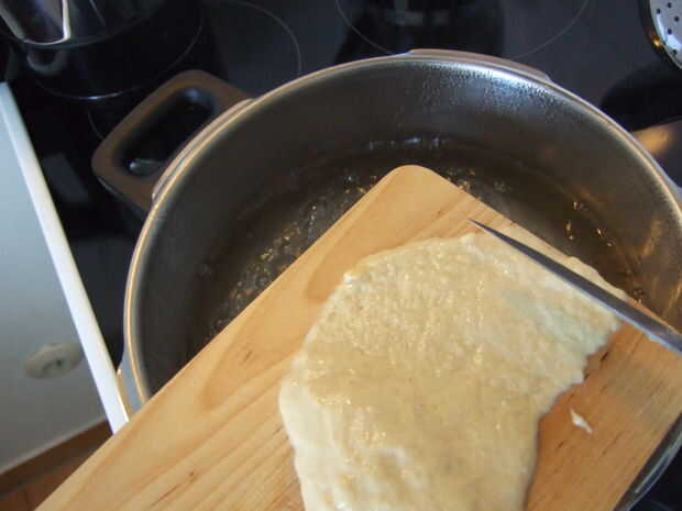 - cortar pequeñas tiras de la masa directamente en el agua hirviendo, mojar el cuchillo cada ahora y después