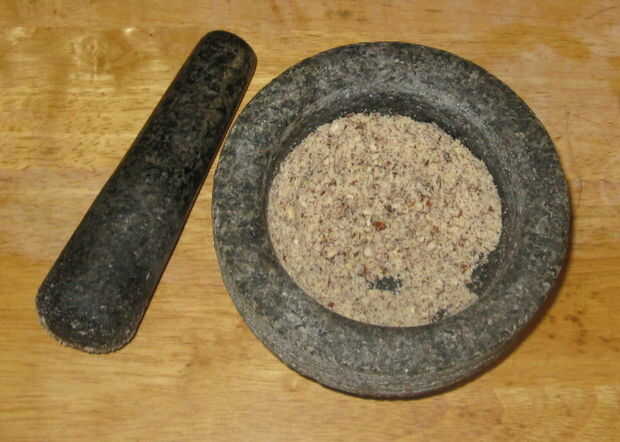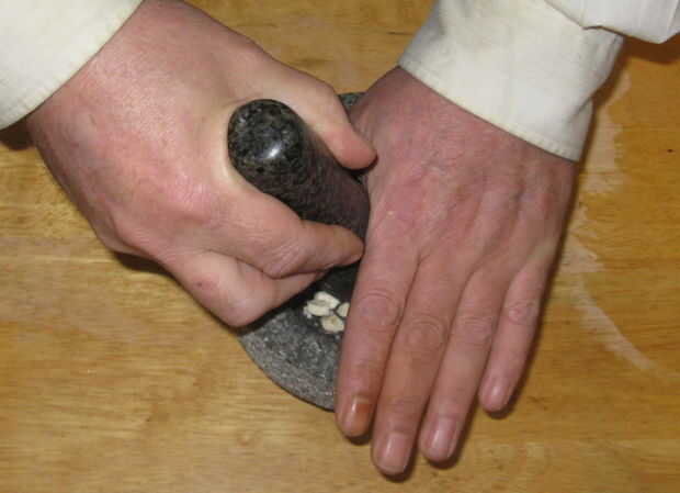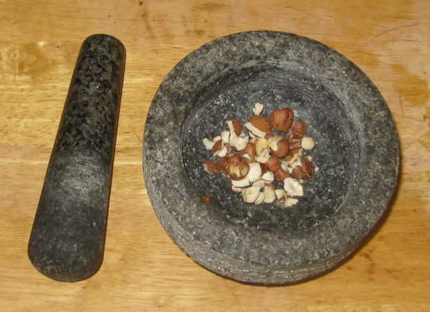 Cuando moler semillas como bellotas colocarlos en el mortero y cubierta para evitar que trozos de volar hacia fuera. Entonces libra y moler hasta que sus nueces son la consistencia desea.