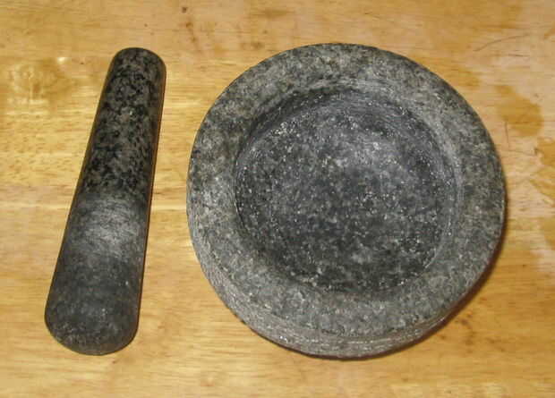 Para hacer su propio mortero y Maja todo lo que necesitas es un plano duro o recipiente en forma de roca para un mortero, evitar pizarra u otra roca sedimentaria suave ya que tienden a la desintegración o trituración para arriba como las tuercas y las semillas. De la mano del mortero se hará una piedra dura redondeada que se ajusta a su mano.