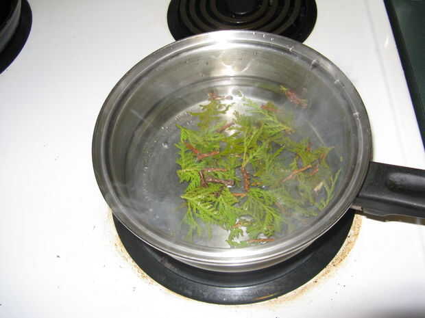 Empezar por encontrar un cedro y desplume de los brotes verdes y colocarlos en agua poner el agua a hervir y dejaron cocer por un par de minutos. Luego Vierta el té en una taza y disfrute, no renuncio a mi Earl Grey para él pero estaba bien.