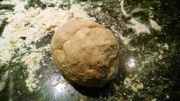 En un tazón pequeño mezcle el huevo, el vinagre y el agua. Añadir a la mezcla de harina y batir con un tenedor hasta que se incorporen bien. Poner la mezcla sobre una superficie enharinada y se reúnen. Amasar un par de veces hasta que se forma una bola.