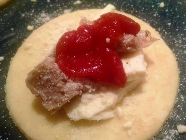 Salchicha de la parrilla y cortado en trozos pequeños. Tome un pedazo de masa; Coloque un poco de la marinera, unos trozos de salchicha, queso mozzarella y espolvorear de queso parmesano. Doblar a la mitad y usando un tenedor presionar los bordes. Para garantizar la masa tomar agua tibia en tu dedo y frote a lo largo de los bordes.