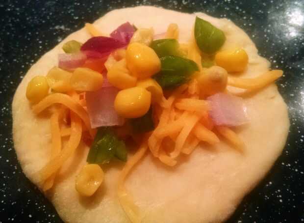 Tome un pedazo de masa; Coloque abajo de queso cheddar, cebolla roja, pimientos jalapeños, pimientos verdes y maíz. Doblar a la mitad y usando un tenedor presionar los bordes. Para garantizar la masa tomar agua tibia en tu dedo y frote a lo largo de los bordes.