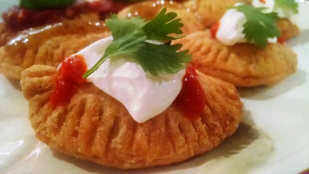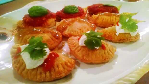 Lugar de empanadas en freidora asegurándose de que hacer un seguimiento de qué tipo es que. Freír hasta que estén dorados, retirar del aceite y colocar en bolsa de papel para drenar. Coloque las empanadas en plato y guarnición.