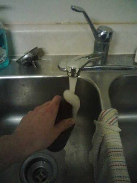 Lavar la botella de vidrio con agua jabonosa caliente.