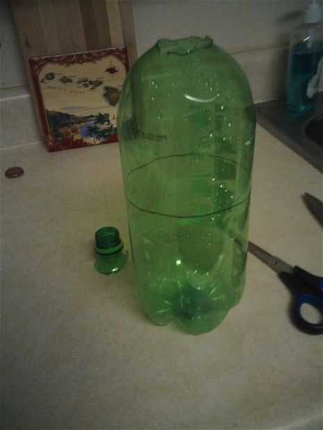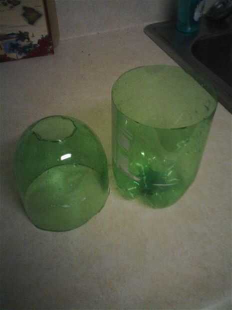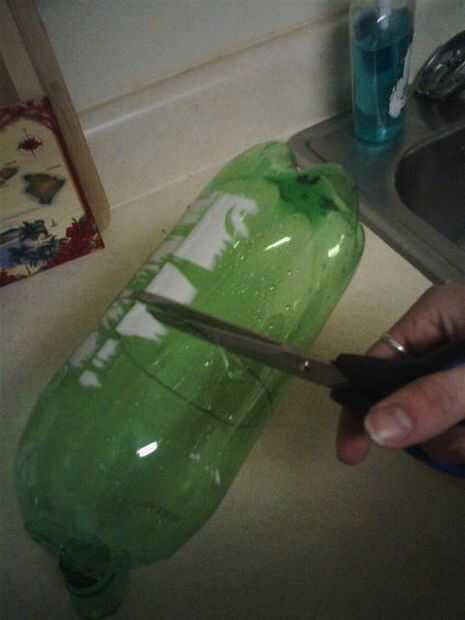 Cortar la botella por la mitad a lo largo de su Ecuador. No el perro caliente manera.