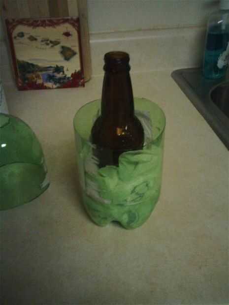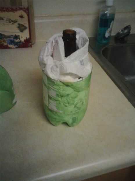 Poner la botella de vidrio en la parte inferior de la mitad de la de plástico. Cosas alrededor del exterior del vidrio hasta que quede ajustada en su lugar.