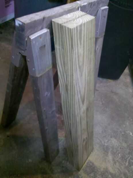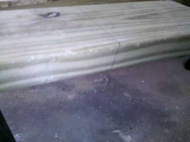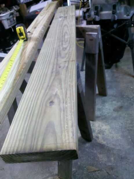 Cortar dos piernas al mismo tiempo, uno para cada caballo. Tuve que usar mi sierra circular porque mi sierra de inglete compuesto no puede cortar tablas más de 6" o algo así. Configurar la sierra para cortar un bisel de 15 º cortar y cortar el final de la Junta para establecer el primer ángulo. Medí a 31