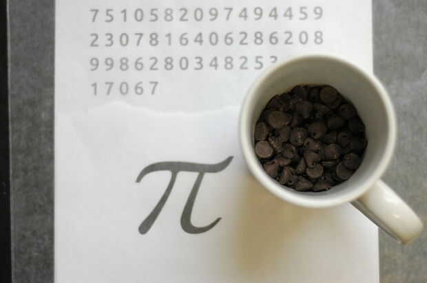 Lugar el chocolate chips en una taza de microondas seguro. Microondas en alto por 20 segundos. Retirar del microondas y remover. Repita hasta que el chocolate se derrita. Dará como resultado largos períodos de tiempo en el horno de microondas quema. Cuchara el chocolate derretido en un sandwich de tamaño bolsa de Ziploc. Cortar una pequeña porción de la esquina de la bolsa. Trazar el contorno de cada número y el gran número pi apretando el chocolate por el orificio creado. Refrigere hasta que esté listo para usar, al menos dos horas.