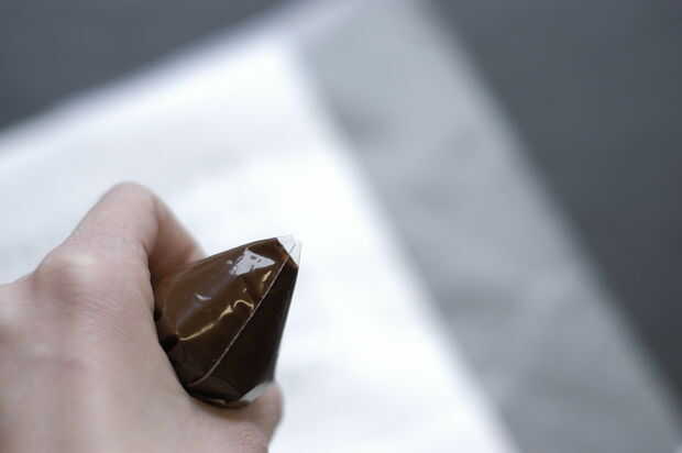 Nota: Elegimos no templar el chocolate porque queríamos la guarnición para derretir en la boca inmediatamente y no a crujido. No dude en templar el chocolate Si prefieres una textura más firme, aunque puede que necesite usar un grado más fino de chocolate.