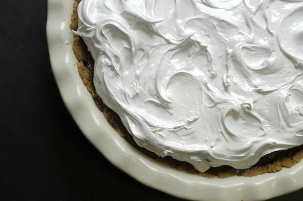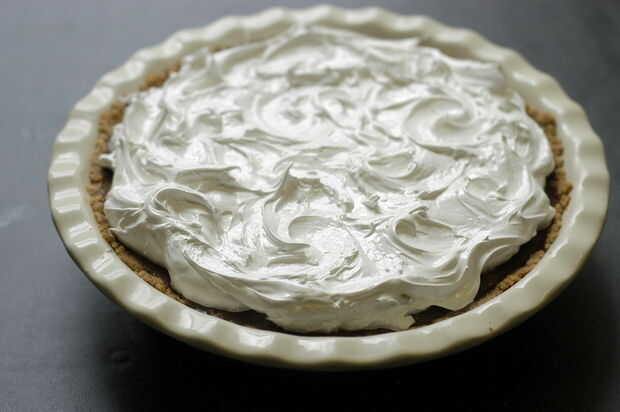 Retire el pastel del refrigerador. Tomar una cucharada de crema de malvavisco y coloque sobre la tarta. Extensión 1 centímetro (alrededor de 0,5 pulgadas) de grosor con 2 cucharas para estirar la créme. Seguir añadiendo crema de malvavisco hasta cubre la superficie de la tarta. Mueva la parte posterior de la cuchara en pequeños círculos sobre el pastel para crear patrones arremolinados.