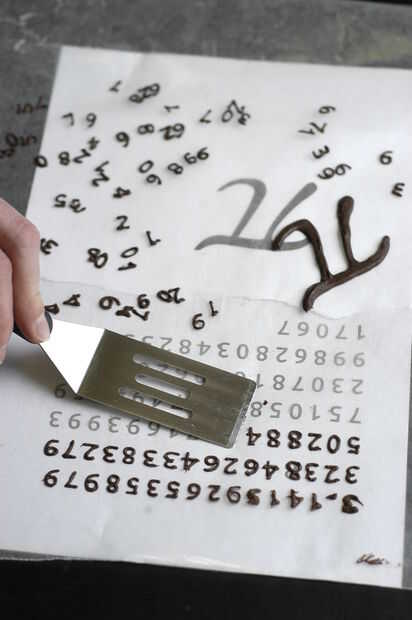 Retire la guarnición de Pi Chocolate del refrigerador. Lentamente raspar el símbolo pi y los números del papel encerado con la espátula de metal fina. Trate de no manejar los números con las manos, ya que su calor del cuerpo puede causar que se derriten y se deforman.