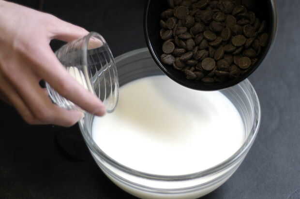 En un tazón grande, apto para microondas, mezclar la leche y el chocolate. Espolvorear la gelatina en la parte superior de la leche y esperar 10 minutos para permitir que el tiempo de gelatina a hidratar. Cubrir y microondas a alta potencia durante 2 minutos. Revolver la mezcla. Continuar a la microonda para intervalos de 1 minuto hasta que el chocolate se derrite en terrones suaves con agitación. La mezcla estará caliente pero no caliente, y el chocolate no se incorporará plenamente a la leche.