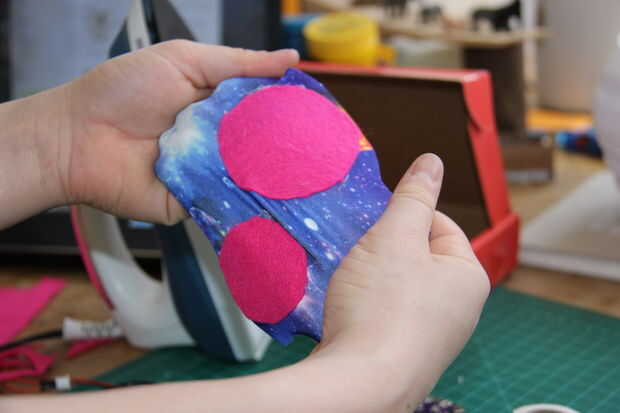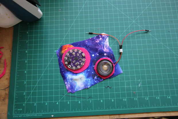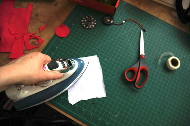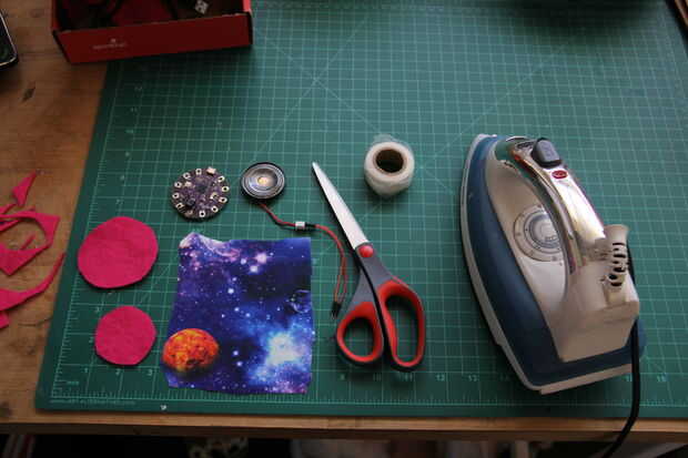 Para montar cualquier parte no suave de su circuito (baterías, bocinas, luz de tablero, micro controladores) usted necesitará crear un lugar resistente de la tela. La técnica Im a mostrar utiliza entretela fusible para combinar a dos telas. Calor de fusión es que un robusto fue unir a una tela rígida a una tela elástica, dejando bordes rígidos fuertes donde se encuentran y que requiere ningunas habilidades de costura.