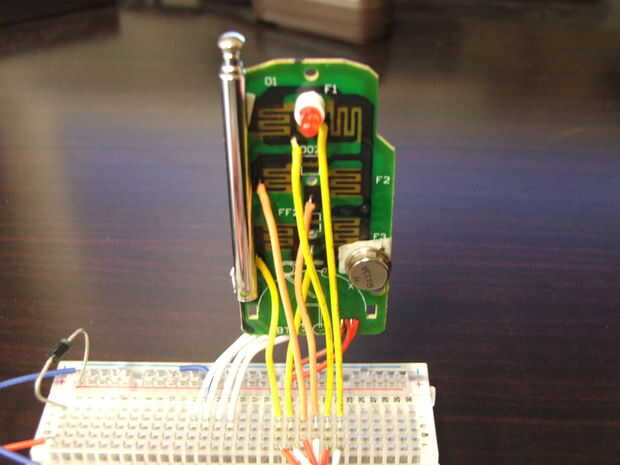 Cada uno de los 6 cables conectados a los electrodos de botón necesita estar conectado a un pin de la mircoprocessor. 3.6V envío a los topes de botón no parece afectar el rendimiento o dañar el transmisor.
