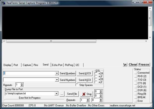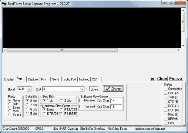 Para controlar el transmisor simplemente Afiance el tablero de LaunchPad a tu ordenador mediante el puerto USB. Abrir favorito programa de terminal y conecte a COM3 en 9600, N, 8, 1. Enviar el correspondiente carácter ASCII y observe el LED del flash de la Junta de transmisor para indicar que se envía el comando. Si los receptores están conectados a un tomacorriente que escuche un clic como el relé y cualquier aparato conectado será activado o desactivado.