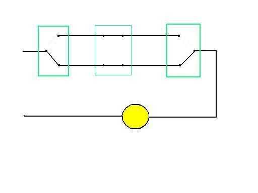 Aquí puede ver un interruptor de cuatro vías a nuestro circuito. Se instala entre dos interruptores de tres vías. En esta gráfica proporciona una vía para la electricidad y la luz está "encendido".