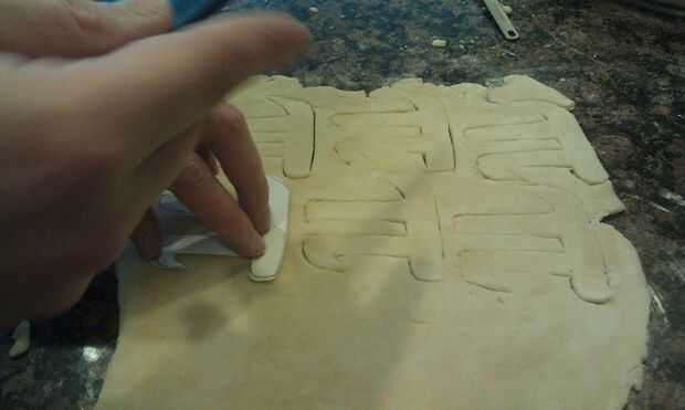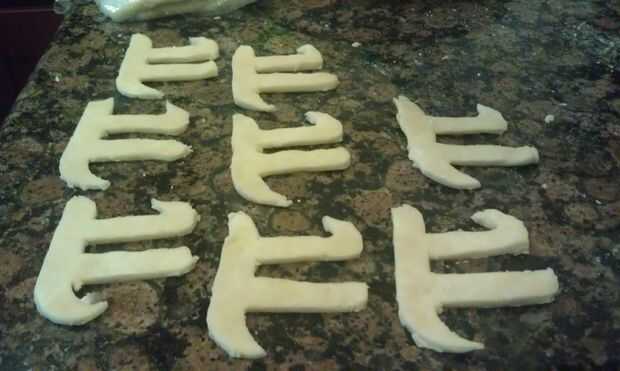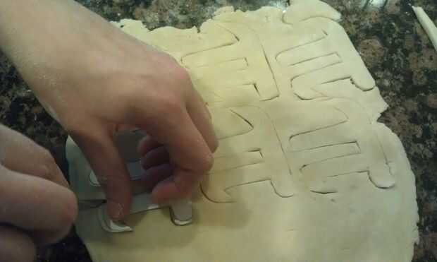 Coloque una plantilla en forma de Pi en la masa y corte cuidadosamente a lo largo de los bordes.