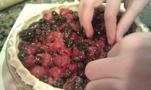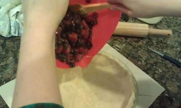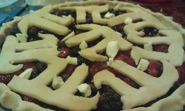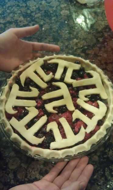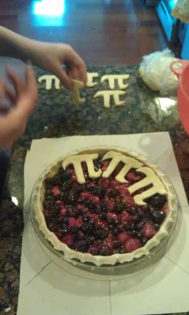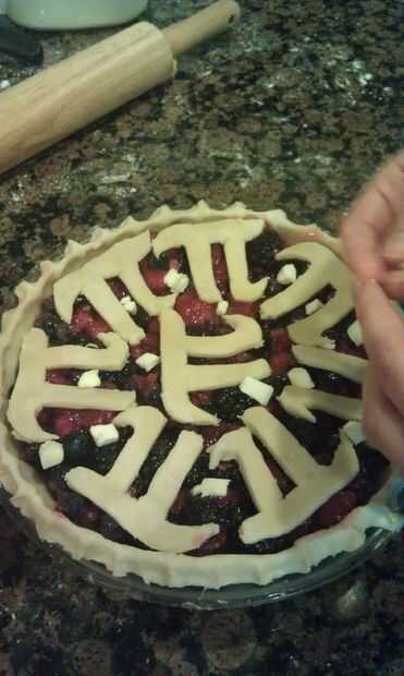 Vierta el relleno en la tarta, colocar decoraciones de Pi y punto con mantequilla.