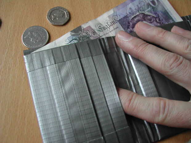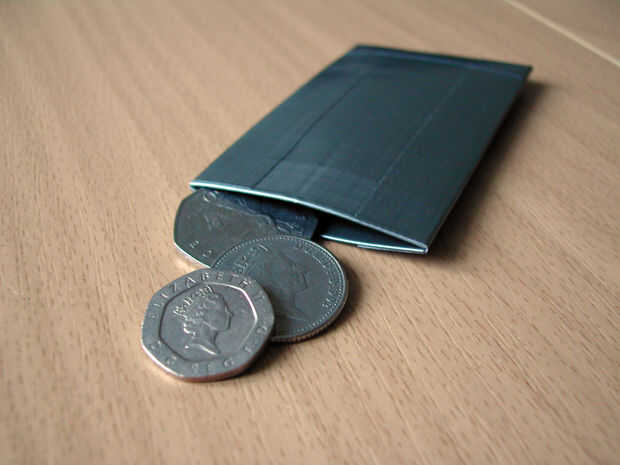 La moneda de la bolsa es el ancho de una sola tira de la cinta pegado a sí mismo y es tan larga como una tarjeta de crédito.