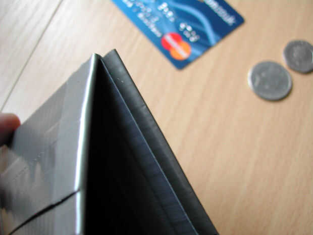 Después de hacer la cartera, había doblado para arriba, entonces utiliza algunas piezas de una cinta adhesiva de baja para mantenerlo en posición cerrada. Puse un pedazo de madera suave (o un libro) en la parte superior del monedero, luego un peso pesado. Esto es mejor dejarlo por unos días.
