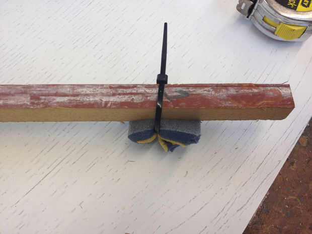 Usar un pequeño trozo de almohadilla de espuma o de alfombra para crear el tren de aterrizaje.  Doblé una pieza de cojín de alfombra y zip ató a cada brazo para proporcionar un amortiguador para aterrizajes.