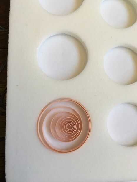 Utilizando las tiras en color B (tono de la piel en la foto), forman una bobina suelta. Esta bobina debe ser cerca de 1 pulgada de diámetro y otra vez, si tiene una plantilla de círculo, colocar la bobina en ese agujero. Repita con las otras 2 tiras. Encolado de las tiras, y luego cualquiera puede colocar la bobina en la plantilla de círculo, o en su estación de trabajo.