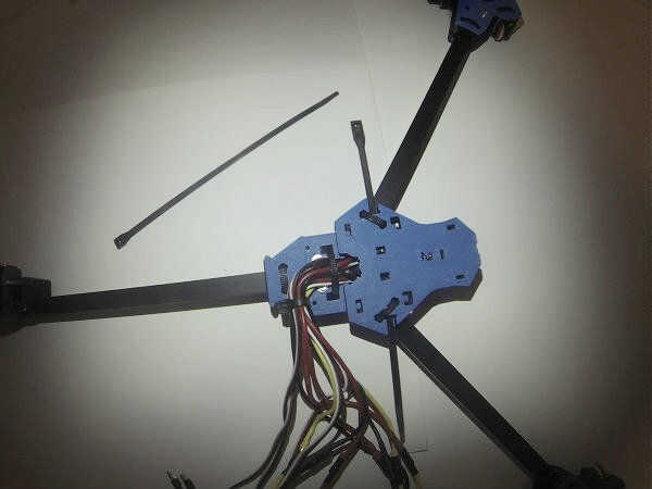 Tire de los cables hacia la cola con el montaje del componente. Ziptie a través de los dos cuadrados orificios del cuerpo y alrededor de los cables para mantenerlos abajo y la espalda.