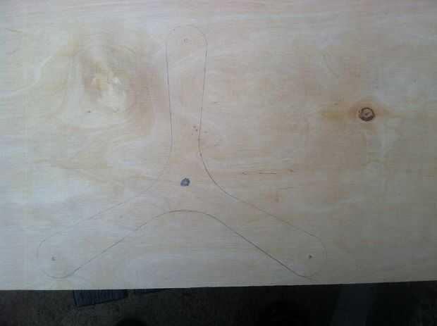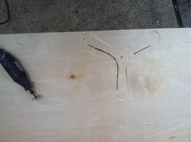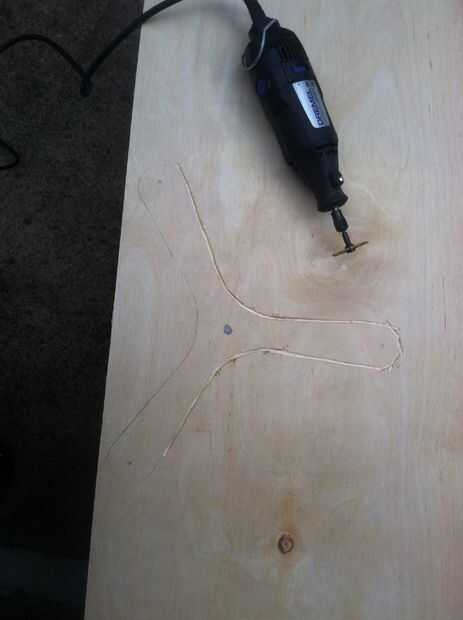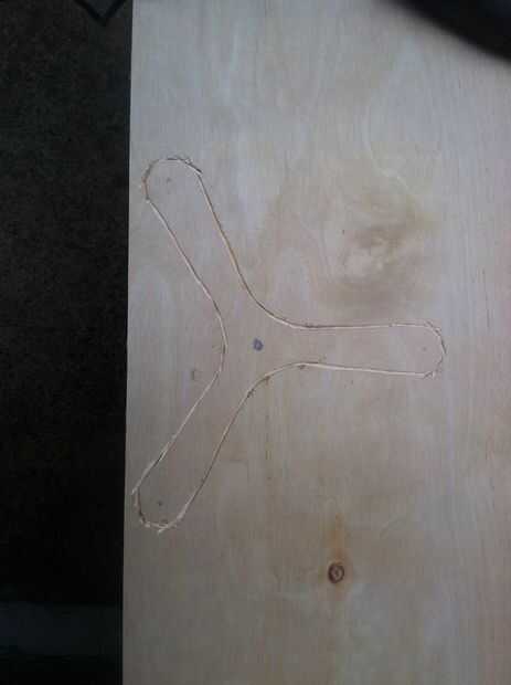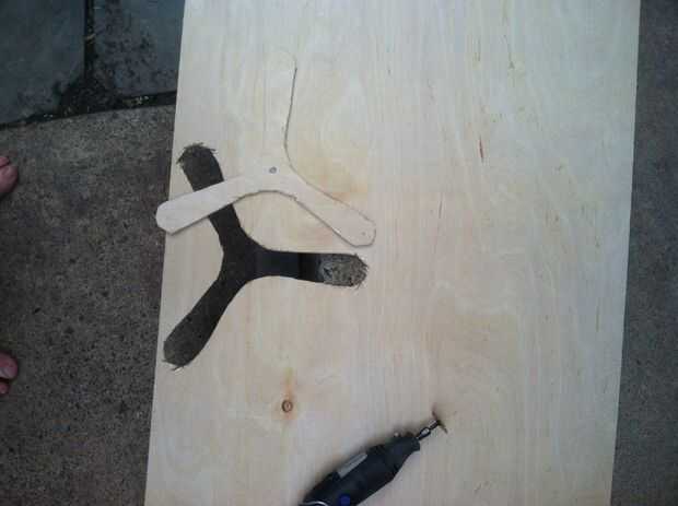 Hay un montón de diseños de boomerang en el Internet para impresión, sin embargo ya tenía un boomerang para que sólo la trazada sobre el tablero. Luego usé mi herramienta dremel para cortar el contorno de la pieza. No tiene que ser exactamente en la línea ya que para que sea la forma correcta en el paso siguiente será arena.