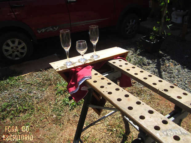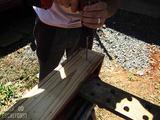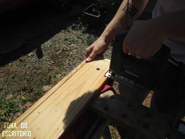 Medir el centro del tablero inferior y trace una línea a lo largo de toda ella. Mide 9, 5cm desde el borde de la tabla y marca otras 3 marcas 9, 5cm unos de otros. Taladro con 1/2 plana en broca, trazar 2 líneas del agujero y use una sierra caladora para cortar hacia fuera.