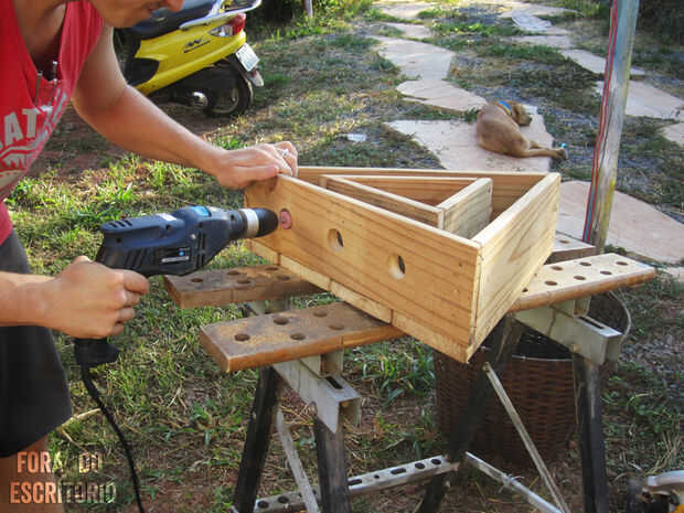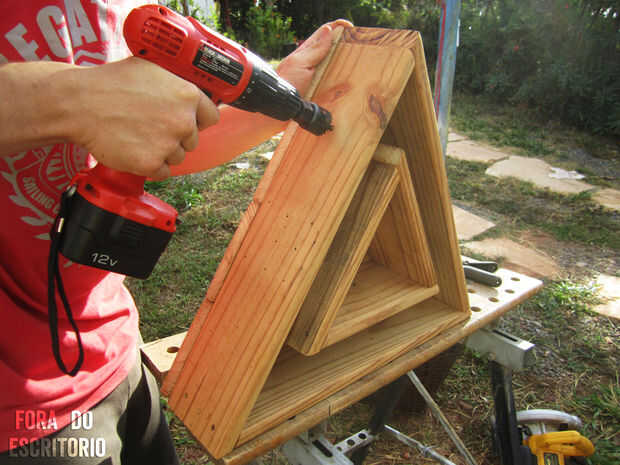 Para los agujeros que las botellas, los perfore paralela al suelo de 32mm (11/4 en) Sierra. Taladre los orificios 13cm desde la parte superior del triángulo y 13cm unos de otros.