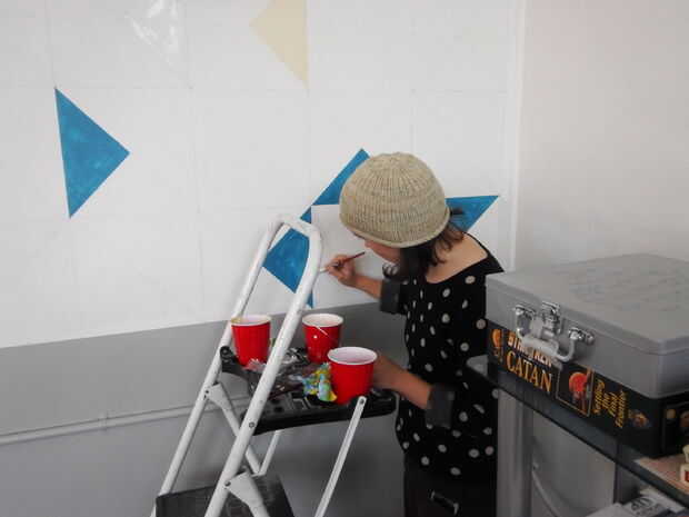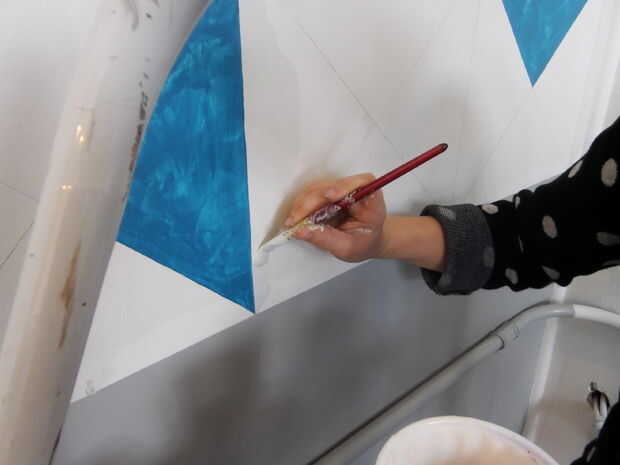 En cuarto lugar, pintar cada triángulo individual pintura las tres esquinas con el cepillo pequeño y la media con el pincel más grande. Pintura en grupos del mismo color ayuda a pintura más eficientemente. Cada triángulo también de 2 a 3 capas de pintura.