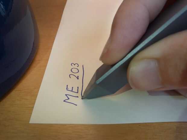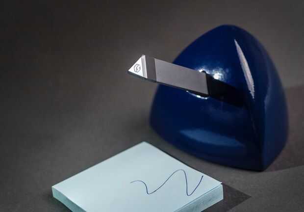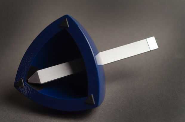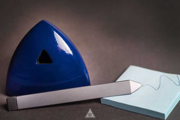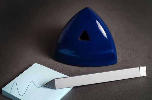 La base es en forma de algo que se llama un sólido de anchura constante, que es una forma que tiene el mismo diámetro en todo el mundo pero no es una esfera. Es mi forma favorita, porque es un recordatorio que nos imaginamos a menudo restricciones en cosas que no existen realmente, tal como nos podríamos imaginar que un sólido con diámetro constante debe ser una esfera. Eso es lo que el pensamiento fuera de la caja es: desechando las limitaciones imaginarias o convencionales, manteniendo los reales. Lo que podría ser un mejor lugar para un recordatorio de luego en una base de una pluma, un instrumento de registro de ideas.
