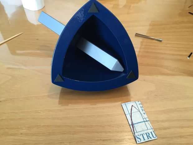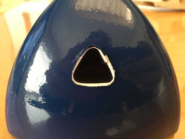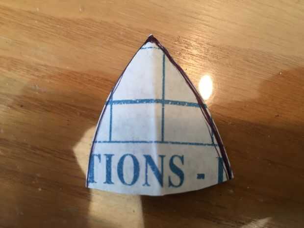 También tenemos que cortar el terciopelo adhesivo a la pluma. Cortar un arco, no una tira, ya que los bordes se curvan, para encajar en la ranura triangular y una forma de escudo a la punta del cojín.