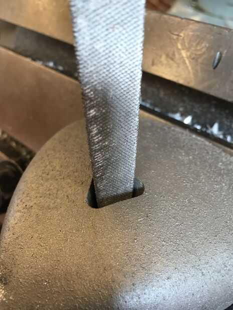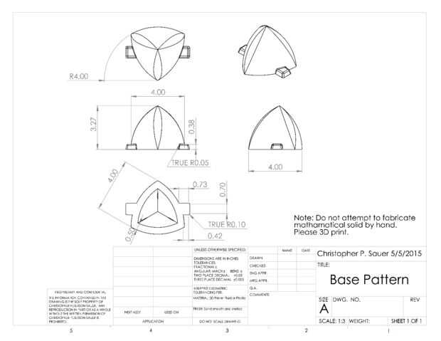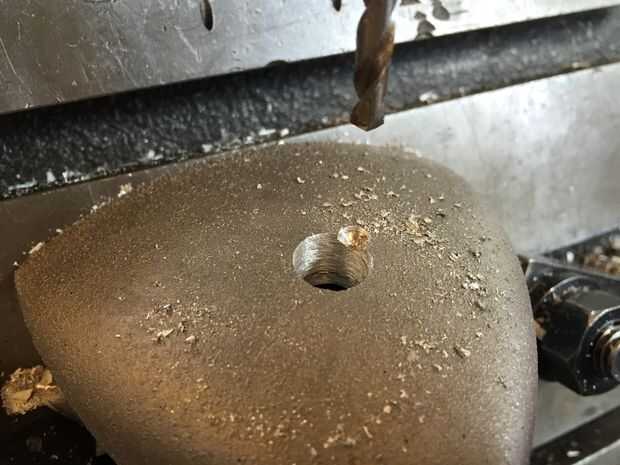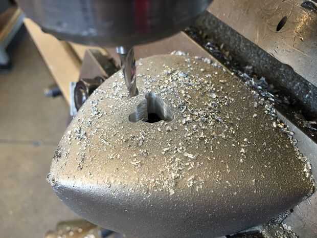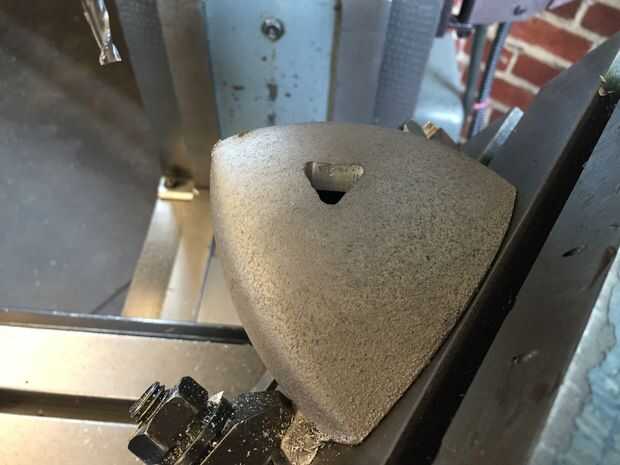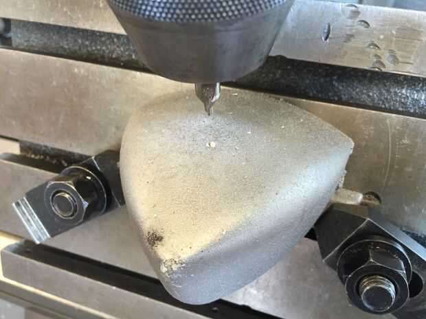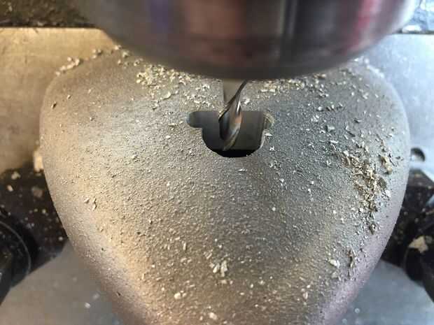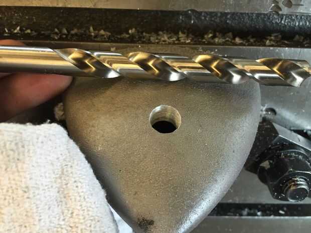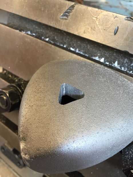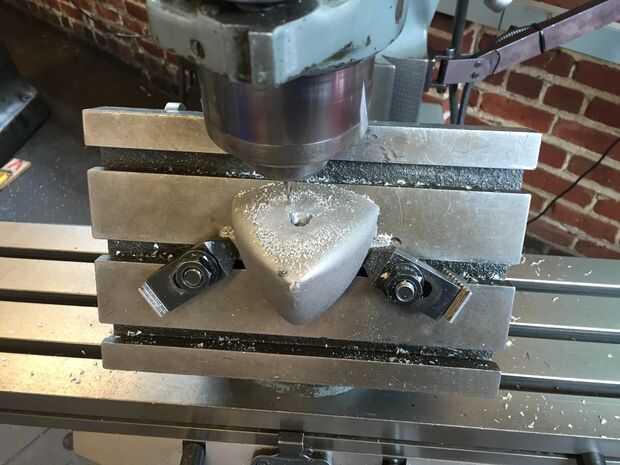Refiriéndose a los planes para la base, use un buscador de borde para determinar donde debe ser el centro de la ranura triangular. Luego, tomar el mayor broca disponible es menor que el diámetro del círculo inscrito en el triángulo y el taladro ese material.