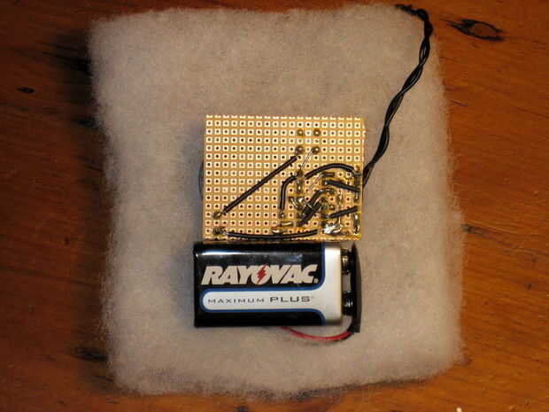 Finalmente. Instalar el IC del CMOS 4093B en el zócalo DIP de 14 pines, conecte la batería de 9V y probar el circuito. Debe sonar algo así como el archivo de mp3 en este enlace: <tribble.mp3tribble.mp3 >. Intentar "machacar" el condensador variable (necesita aislar y el resto de la electrónica, de la mano) y observe el cambio de tono.