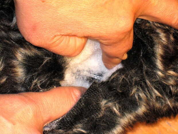 Después de la electrónica y el relleno se han insertado en la "bolsa", coser una tira de 4 pulgadas de 3/4 de pulgada del Velcro en el exterior de la su apertura. Puede quitar la piel, como se muestra en la figura 1, en donde el Velcro debe fijarse antes de coser en su lugar. También puede coser los bordes de la abertura cerraron un poco para reducir su tamaño. La abertura con cierre de Velcro será el portal a través del cual se puede cambiar la batería de 9V por lo que no necesita ser lo suficientemente grande como para pasar el módulo de electrónica todo una vez que la electrónica se rellena dentro. El Velcro se Haz oculto (sobre todo) cuando el portal se cierra porque se le dobla. La figura 2 muestra la confirmación de acceso de la batería.