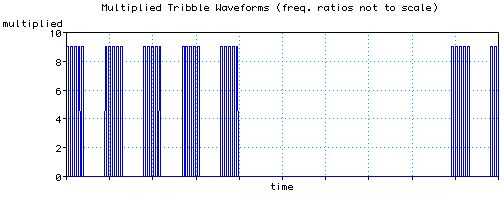 La figura 1 muestra el voltaje vs gráfico de tiempo de las tres señales que queremos mezclar (y el resultado mixto). Trazas rojas son los voltajes RC. Rastros del azul son las salidas de los "inversores" (realmente NAND Schmitt Trigers) de las etapas.