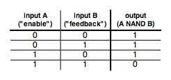 Las siguientes dos etapas del oscilador (NAND2 y NAND3) tienen una operación similar, salvo que sus entradas no se unen juntos para convertirlos en inversores. En su lugar una de las entradas de cada NAND se utiliza como una línea de "activar" con una señal proveniente de la primera etapa. Cuando son altas las entradas de "activar" NAND2 y NAND3 entonces NAND2 y NAND3 pueden oscilar como la NAND1 etapa hace (pero con constantes de tiempo diferentes). Pero cuando las entradas de "activar" NAND2 y NAND3 se llevan a cabo bajo sus salidas son obligados ser alta ya que la única manera que los resultados podrían ir bajo sería para que ambas entradas a ser alta. La tabla de verdad NAND abajo lo explica todo.