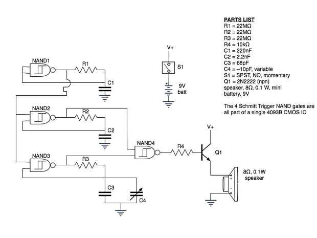 El último aspecto del circuito es el condensador variable C4 en la tercera etapa de oscilador. Este condensador se agrega en paralelo con C3 y se construye de dos hojas de lámina de cobre con un espaciador compresible entre ellas. El propósito de C4 es añadir un poco de "carácter" el sonido hecho por el juguete. Cuando las placas de lámina se exprimen juntas la brecha se reduce y que aumentará la capacidad de C4 (la capacitancia es proporcional al área de la placa e inversamente proporcional a la separación de la placa). Aumentando la capacitancia combinada de C3 y C4 disminuye un poco la frecuencia del oscilador del tercer "tono" de etapa. El efecto es pequeño pero sensible.