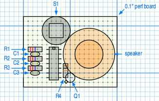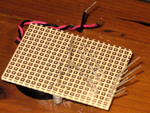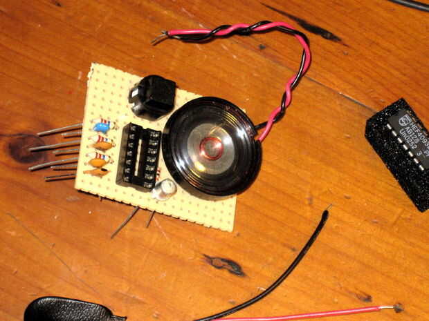 Puede doblar los cables de la parte ligeramente para que no caigan fuera de la Junta de perf demasiado fácilmente. También puede anclar eventualmente lado de imán de altavoz a la Junta de perf por medio de un pequeño trozo de cinta de pegar o se flop alrededor de una manera molesta. ADVERTENCIA: no coloque el IC del CMOS en el tablero todavía! Coloque sólo 14 perno socket DIP y tenga el IC en su embalaje protector hasta que termine con la construcción de la placa de circuito.