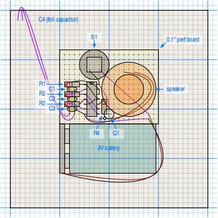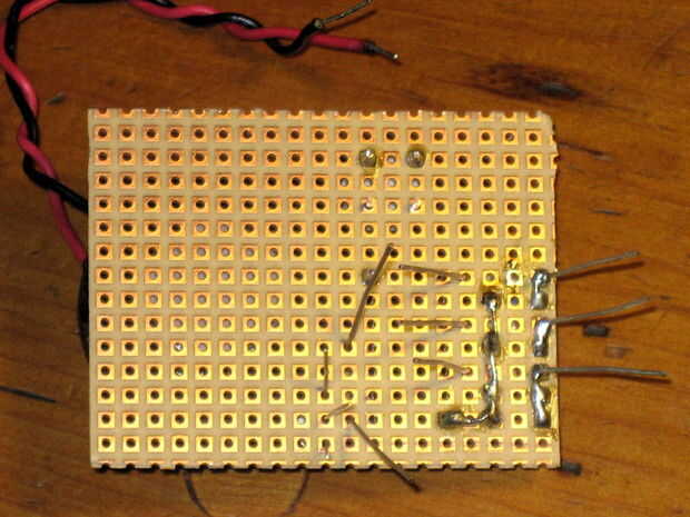 Comienzo por cableado la tierra conduce de C1, C2 y C3 al pin 7 del conector DIP. Esto forman a una especie de "bus de tierra", ancla los condensadores y conseguir algunos de los cables fuera del camino. Luego conecte C1 a R1, C2 R2 y C3 a R3, como se muestra esquemáticamente en la figura 2 y como se ve en la parte posterior de la Junta en la figura 3.